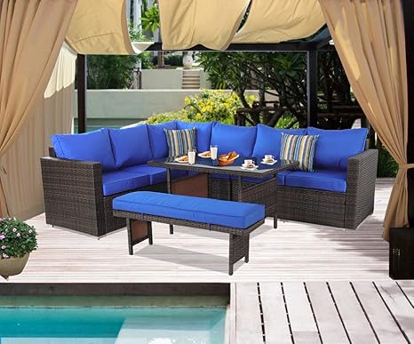 Outdoor Furniture Dining Sofa Set Patio Garden Seating Brown Wicker Royal Blue Cushion 5 Piece