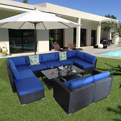 Patio Rattan Sofa Set Outside Sofa Black Rattan Wicker Couch Set Garden Outdoor Seating Royal Blue Cushions 12pcs