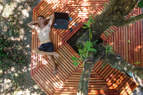 Asian Man Lying On The Outdoor Seating Under The Tree During Summer